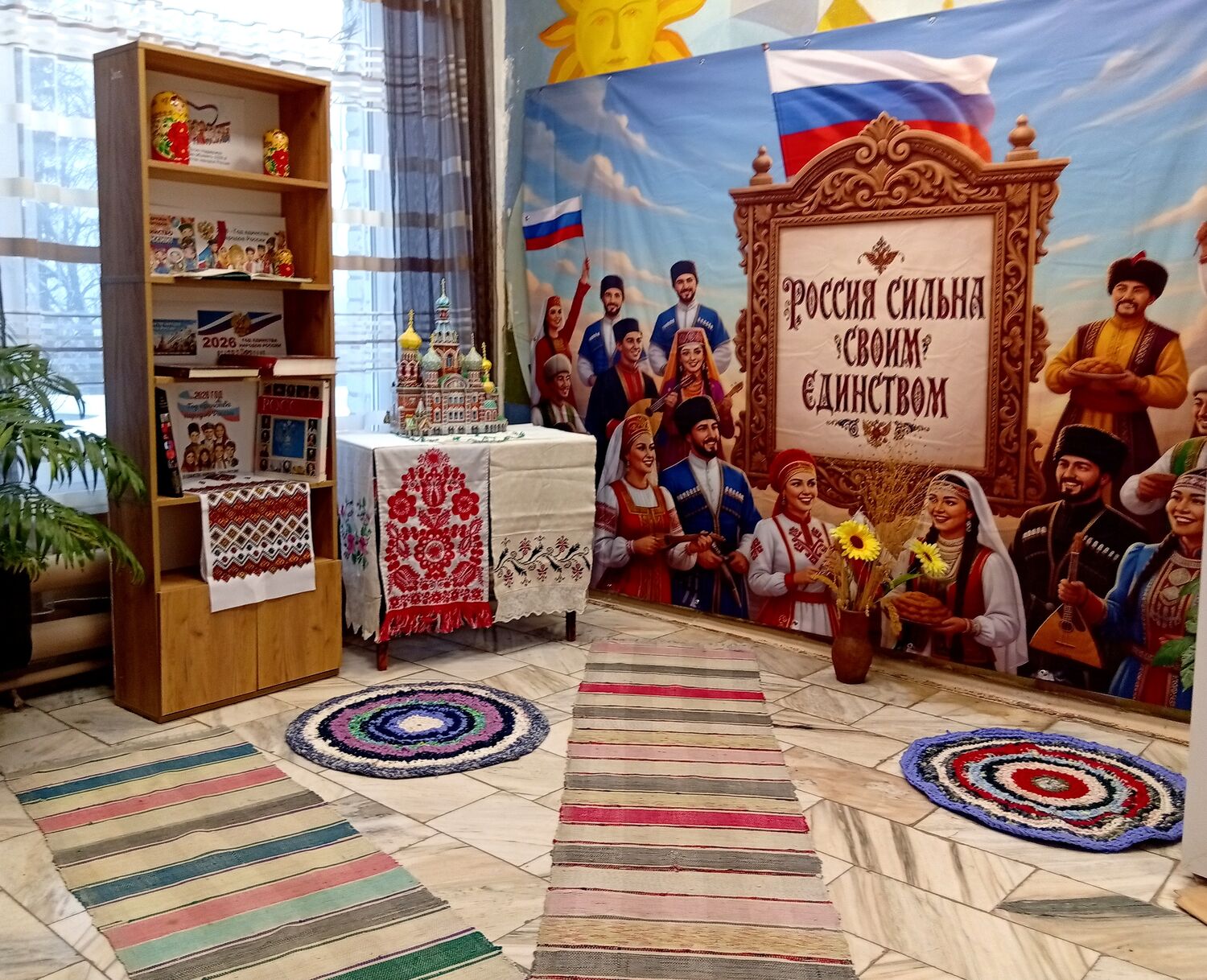 В 2026 году в нашей стране пройдет Год единства народов России, который символизирует общие корни и будущее всех граждан. На церемонии открытия Года единства президент Владимир Путин подчеркнул, что веками уважение к народам, которые вошли в состав России, стало основой национального единства. Россия отличается тем, что на её территории в мире и согласии живут более 190 этносов, говорящих на сотнях языков. Это разнообразие — наше богатство, а единство — наша сила. В течение года наша библиотека организует разнообразные тематические мероприятия и выставки, приуроченные к этому знаменательному событию. Они будут проходить во всех библиотеках района. Приглашаем всех желающих посетить эти культурные события. Для гостей открыта фотозона под названием «Единство-наша сила», оформленная в цветах национального флага: красном, синем и белом.
