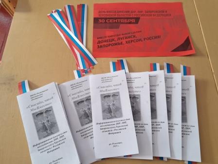 30 сентября 2022 года Россия приняла в свой состав Донецкую Народную Республику, Луганскую Народную Республику, Запорожскую и Херсонскую области. Это событие стало результатом волеизъявления жителей, которые выразили желание присоединиться к России. В честь этого важного дня Районная библиотека организовала уличную акцию «Вместе навсегда!». Сотрудники библиотеки рассказали об исторических событиях, связанных с республиками, и значении этого шага. Они подчеркнули единство новых регионов с Россией. Участники акции получили тематические информационные материалы и триколоровские ленточки, рассказывающие о происхождении этого праздника.
