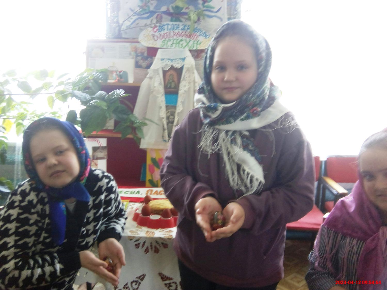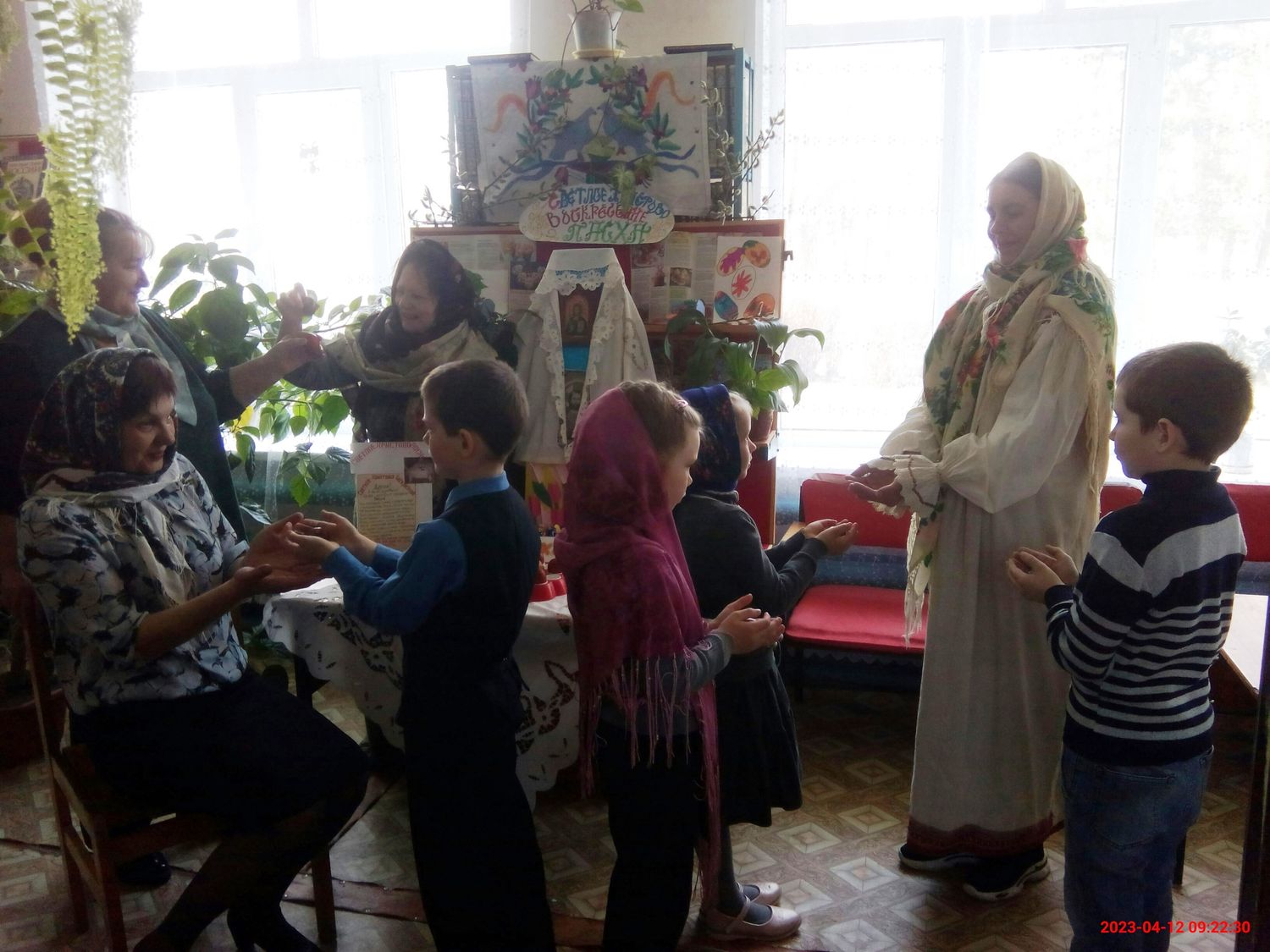 Организаторы мероприятия попытались донести ребятам дух пасхальной восторженности, веселья. Участники встречи прочитали стихи поэта-земляка М.Д. Шумейко "Пасха" и "Чистый четверг". Учитель Проничева Е.И. прочитала стихотворение С. Есенина "Благовест". Украсила мероприятие Тюрина А.В, которая исполнила песню "Молитва". В свою очередь, дети с большим азартом и радостью сыграли в "битки".